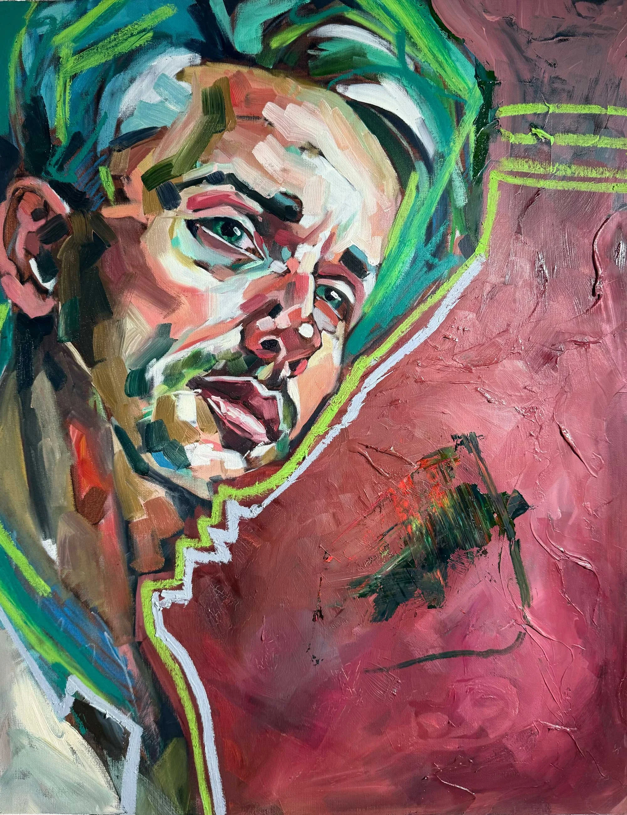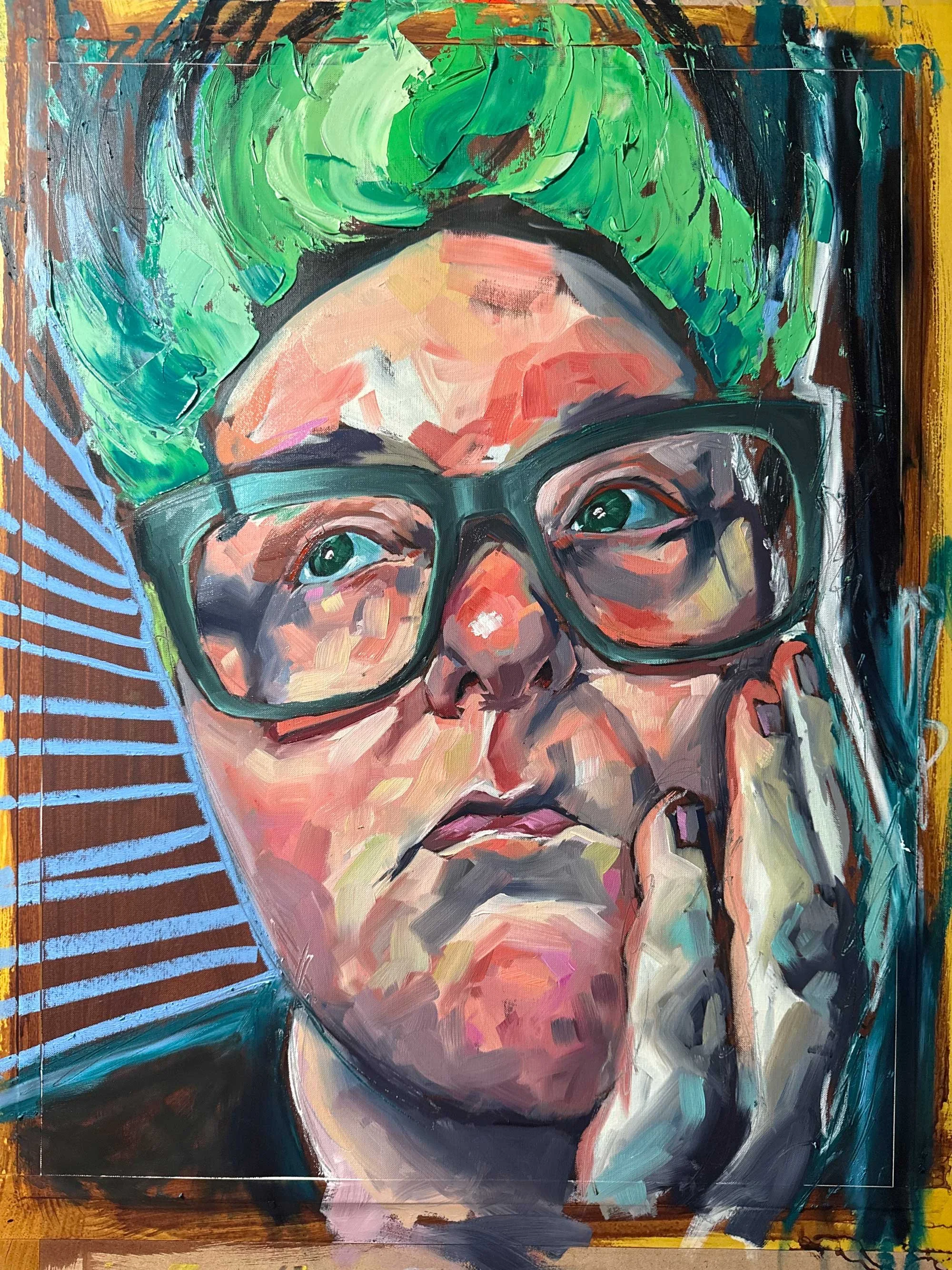 On a Friday night in August, I set out with no plan, just a need to paint. What began as a quick self-portrait reference under a swung-around daylight lamp became Drift: a bold, instinctive work mixing greens and violets, painted in one sitting. It’s a piece about switching off, finding flow, and letting the painting lead.