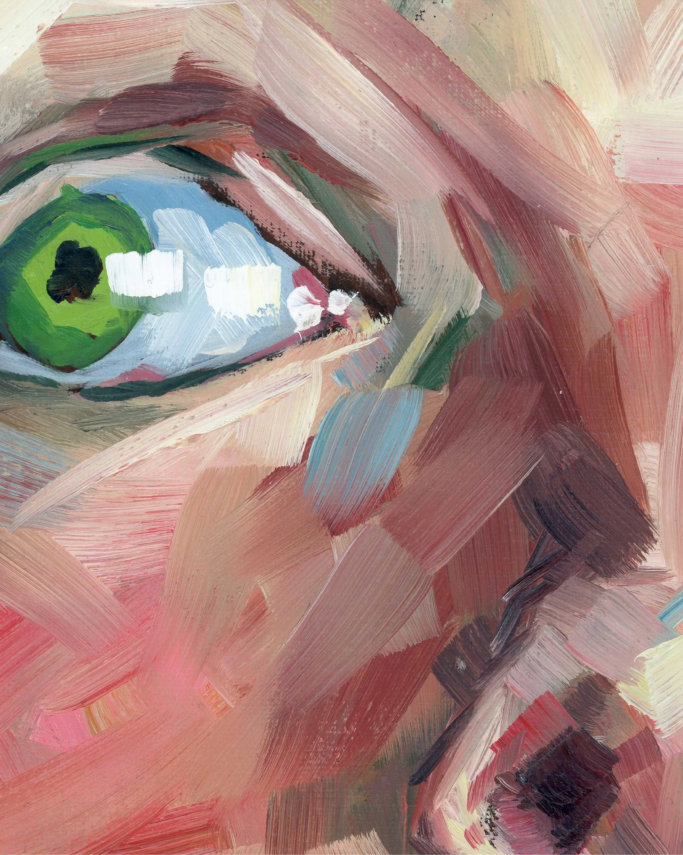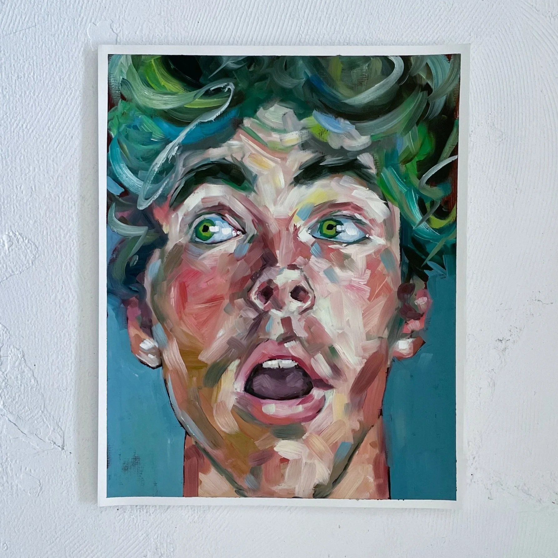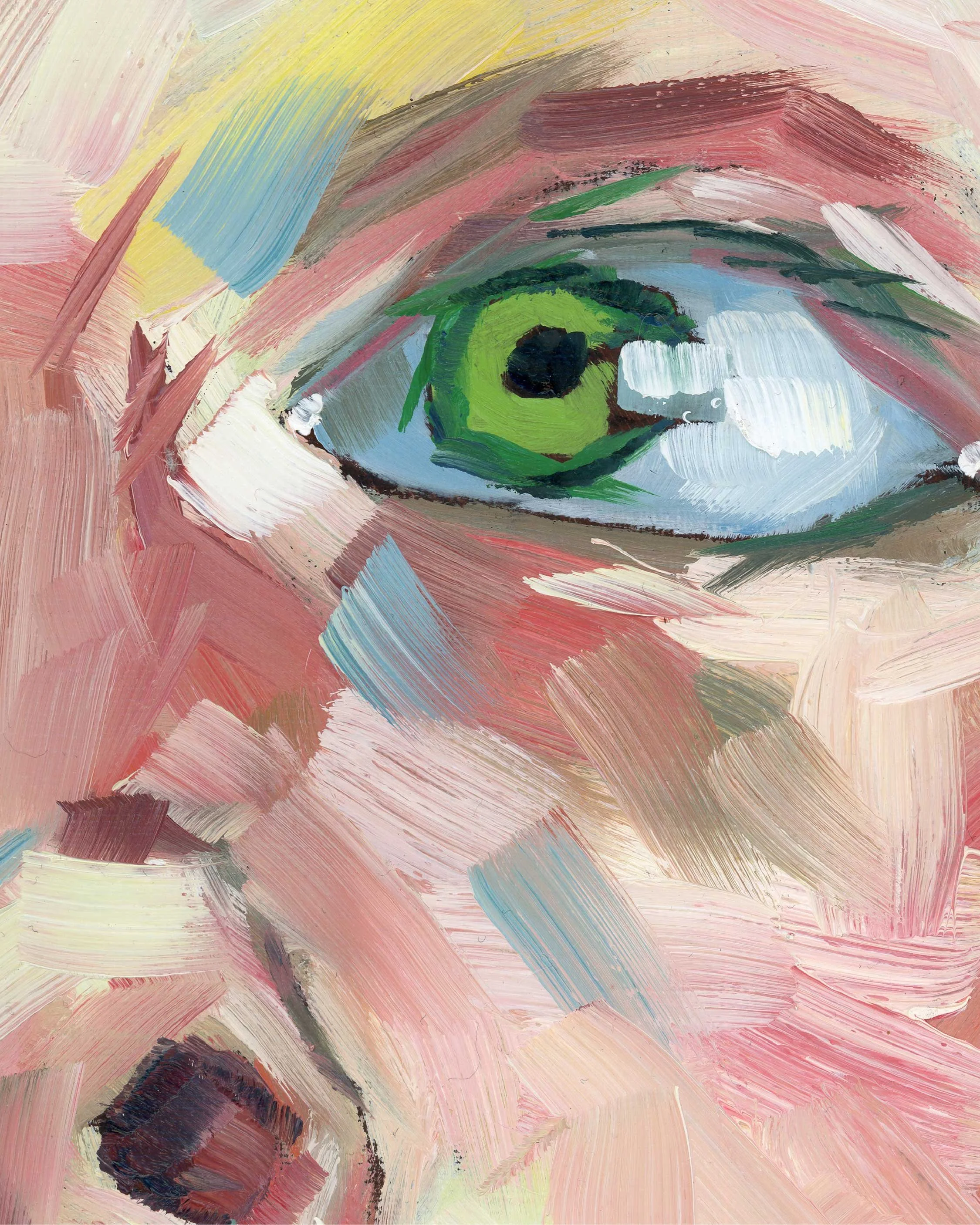 There wasn’t some grand plan or theme behind the painting. Like Boy in the Red Glasses, I was drawn to a reference image, specifically to the dreamlike expression of the boy’s face. I’m always looking for a certain kind of gaze, that curiosity and wonder that sits just behind the eyes. It’s never about copying the image. I start with it, but then I exaggerate wildly. I build the face through geometry and colour. I heighten everything. I enter my own Technicolor world - like Judy Garland stepping out of black-and-white Kansas and into Munchkinland. That metaphor from The Wizard of Oz has always stuck with me. It’s how painting feels.