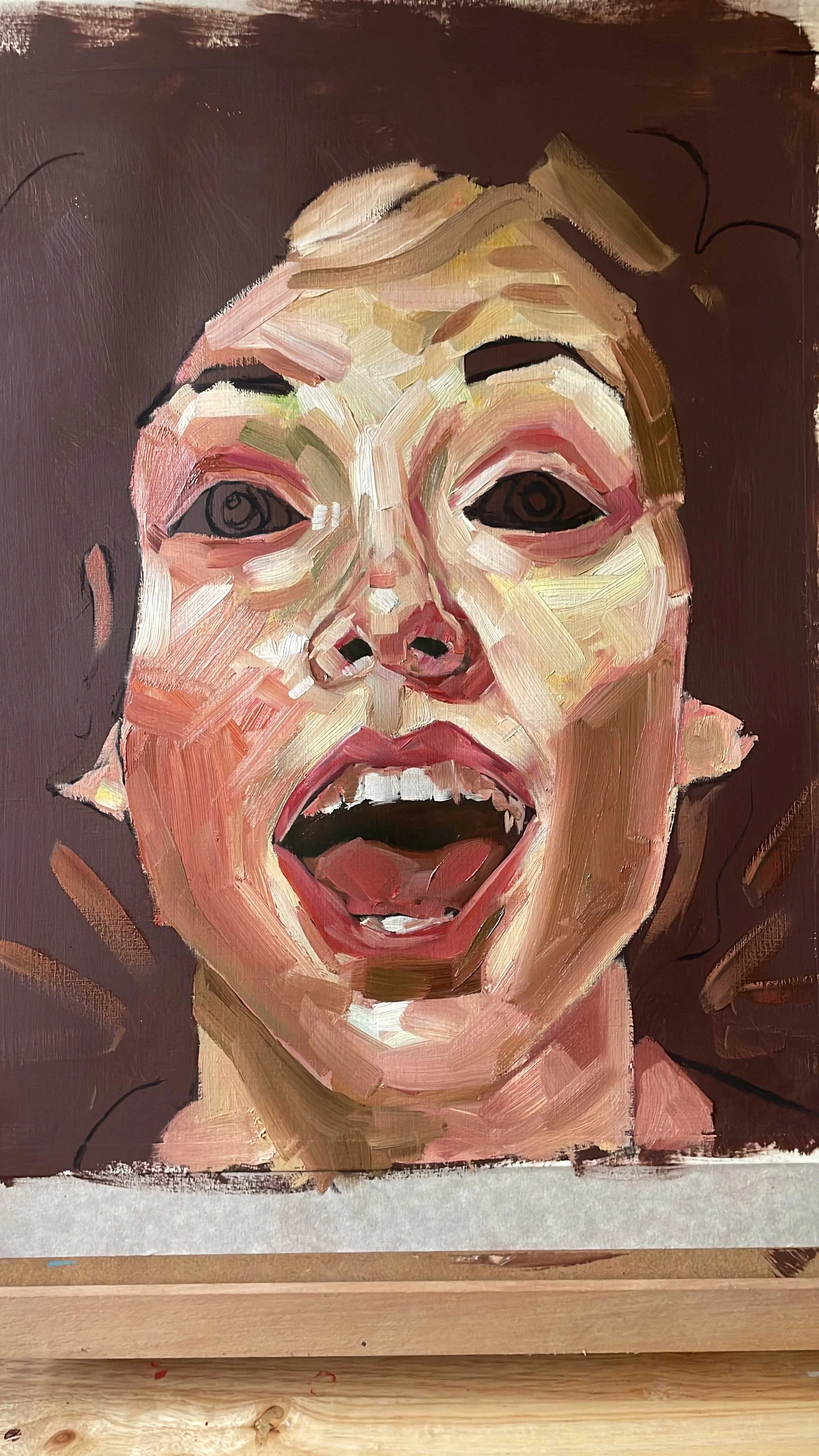 So I started looking. Thousands of reference images, trying to find someone who had that same charged energy. When I found her, the woman I used as the basis, I wasn’t interested in her likeness. That wasn’t the point. She had a flash of something in her face - a quick charge of wonder - and that was enough for me to jump in. My paintings in this series don’t aim to replicate the reference. They’re a departure. The reference is just the ignition. Once the emotion is there, I take over.