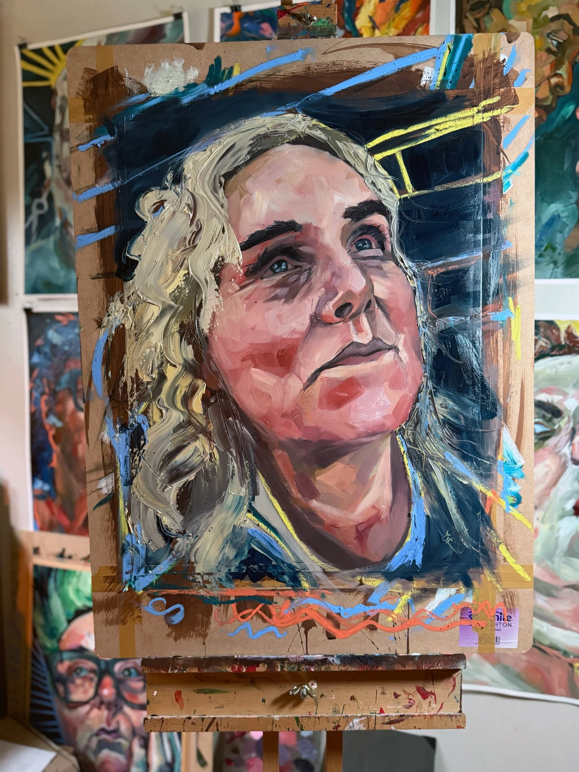 Painted live during Birmingham Open Studios at • nook • gallery & studios, this portrait captures artist Tara Harris through earthy tones and quiet honesty. The piece explores friendship, creative connection and shared energy between two painters - a tête-à-tête in paint.