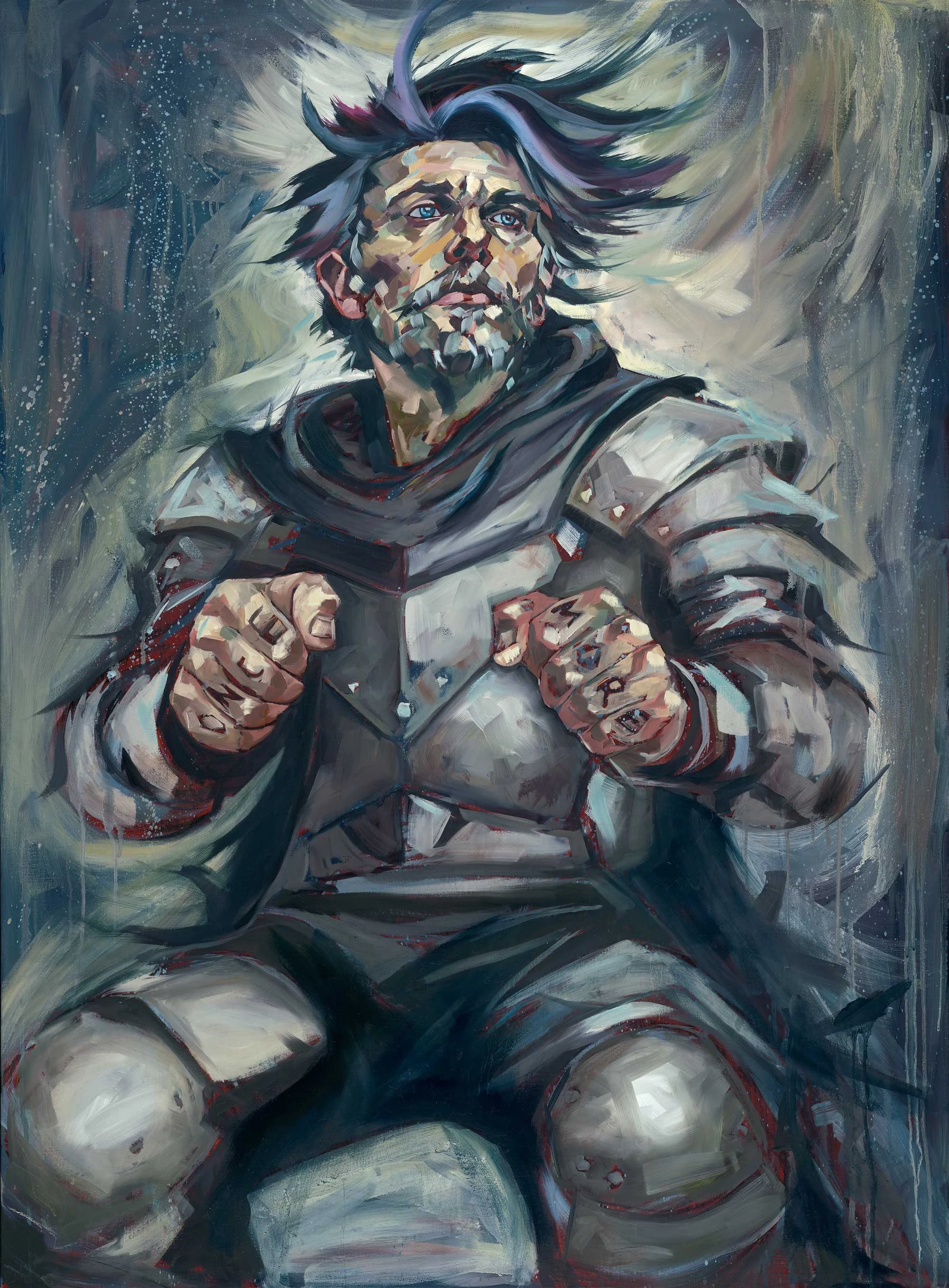 Once More responds to “tilting at windmills” as a psychological state rather than a literal scene. The figure rides forward, yet there is no horse beneath him. The work sits in the tension between belief and reality, where conviction overrides logic. Hints of armour appear, but they feel symbolic rather than functional. This is not a portrait of heroism, but of endurance. It speaks to the human tendency to hold onto belief, even when reality contradicts it.